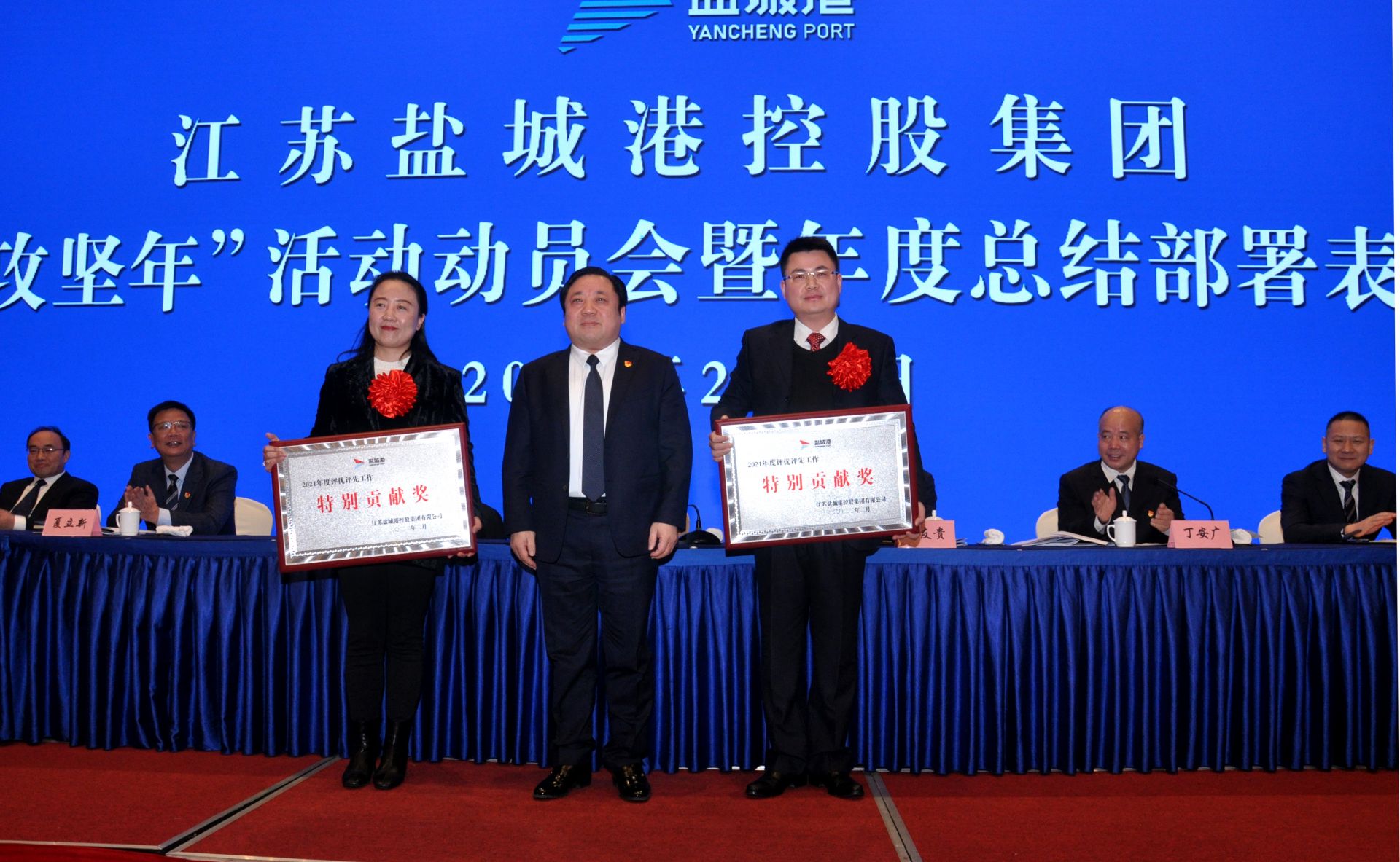 會議為2021年度集團受表彰的先進集體、先進個人、卓越工匠以及營銷標兵代表進行了頒獎,大豐海港控股集團、濱海港開發集團、國際陸港集團、項目建設管理公司、集團企業管理部分別圍繞主題作了表態發言。
