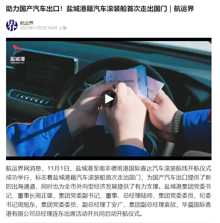 鹽城港至南非德班港國際直達汽車滾裝航線開航