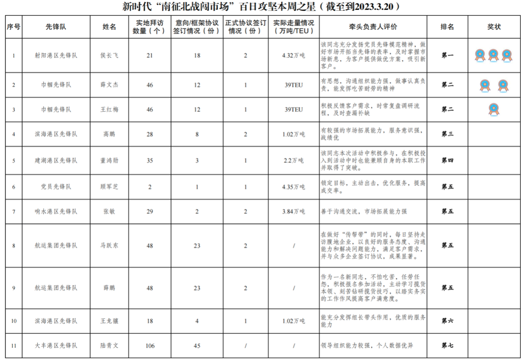 第三名:濱海港區(qū)先鋒隊 高鵬(拜訪客戶28家,簽訂意向協(xié)議8份,簽訂正式協(xié)議2份,實際走量1.02萬噸)