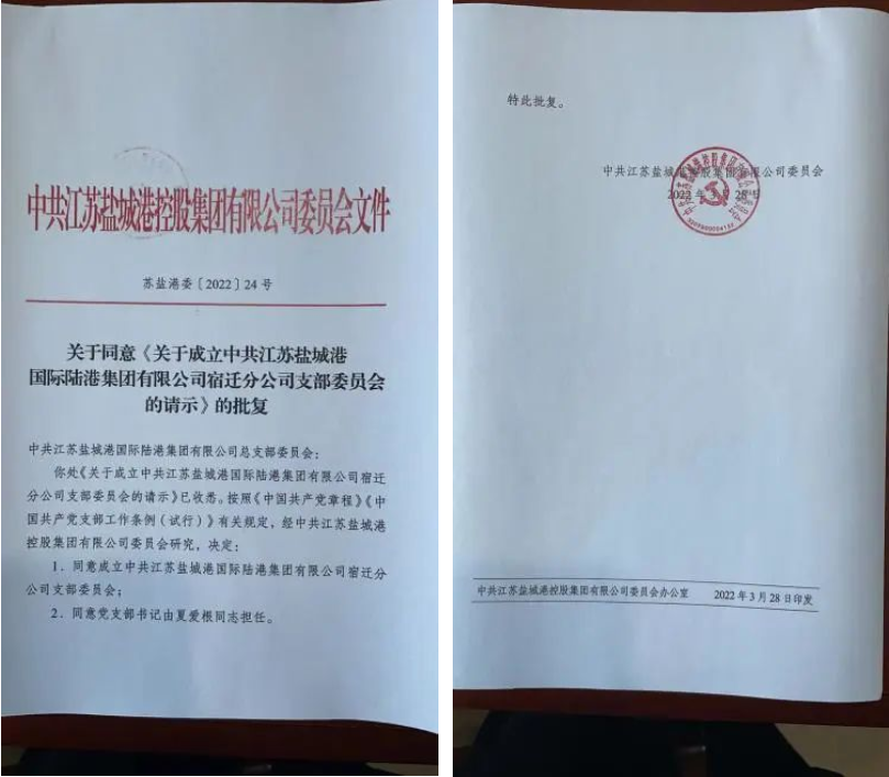 3月28日,中共江蘇鹽城港國際陸港集團宿遷分公司黨支部成立;