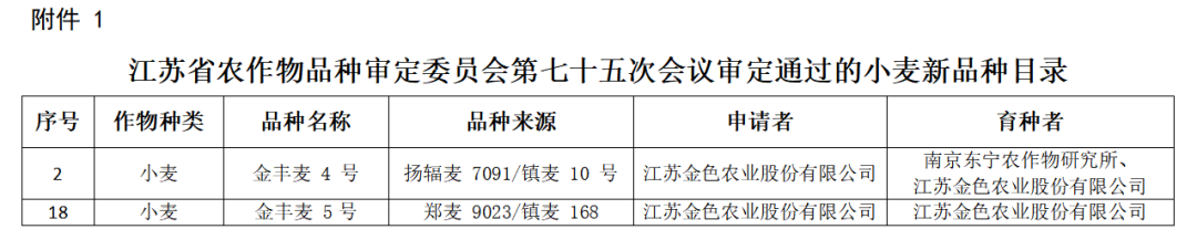 近日,農(nóng)業(yè)科技集團所屬金色農(nóng)業(yè)自主選育的“金豐麥4號”“金豐麥5號”兩個小麥品種順利通過江蘇省主要農(nóng)作物品種審定,并完成公示程序。這是繼2019年-2023年期間獲審的“金豐麥1、2、3號”后,又一批通過審定的小麥品種,至此,農(nóng)業(yè)科技集團形成具有自主品種權(quán)的“金豐麥”品系。