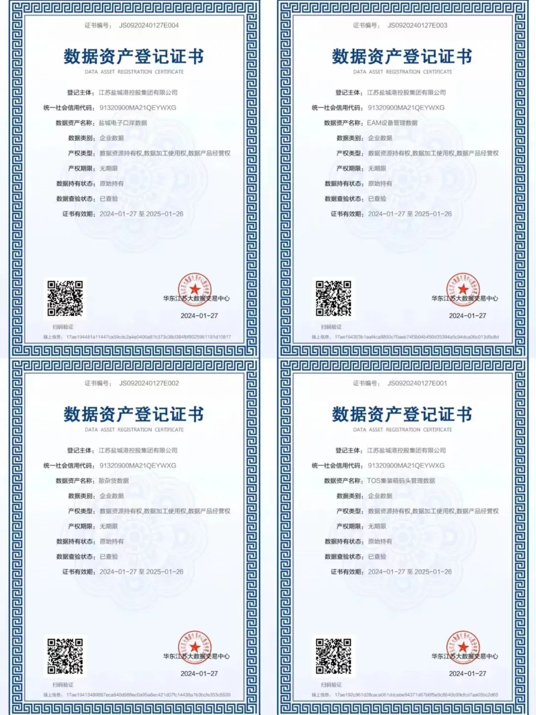 日前,鹽城港集團(tuán)順利完成集裝箱碼頭生產(chǎn)操作系統(tǒng)(TOS)、電子口岸系統(tǒng)、港機(jī)設(shè)備物資管理系統(tǒng)(EAM)、散雜貨生產(chǎn)管理系統(tǒng)(MES)數(shù)據(jù)資產(chǎn)質(zhì)量評價及價值評估,并獲得《數(shù)據(jù)資產(chǎn)登記證書》,成為鹽城市首批完成數(shù)據(jù)資產(chǎn)登記的企業(yè)之一,也是全國首個港口企業(yè)數(shù)據(jù)資源入表案例。