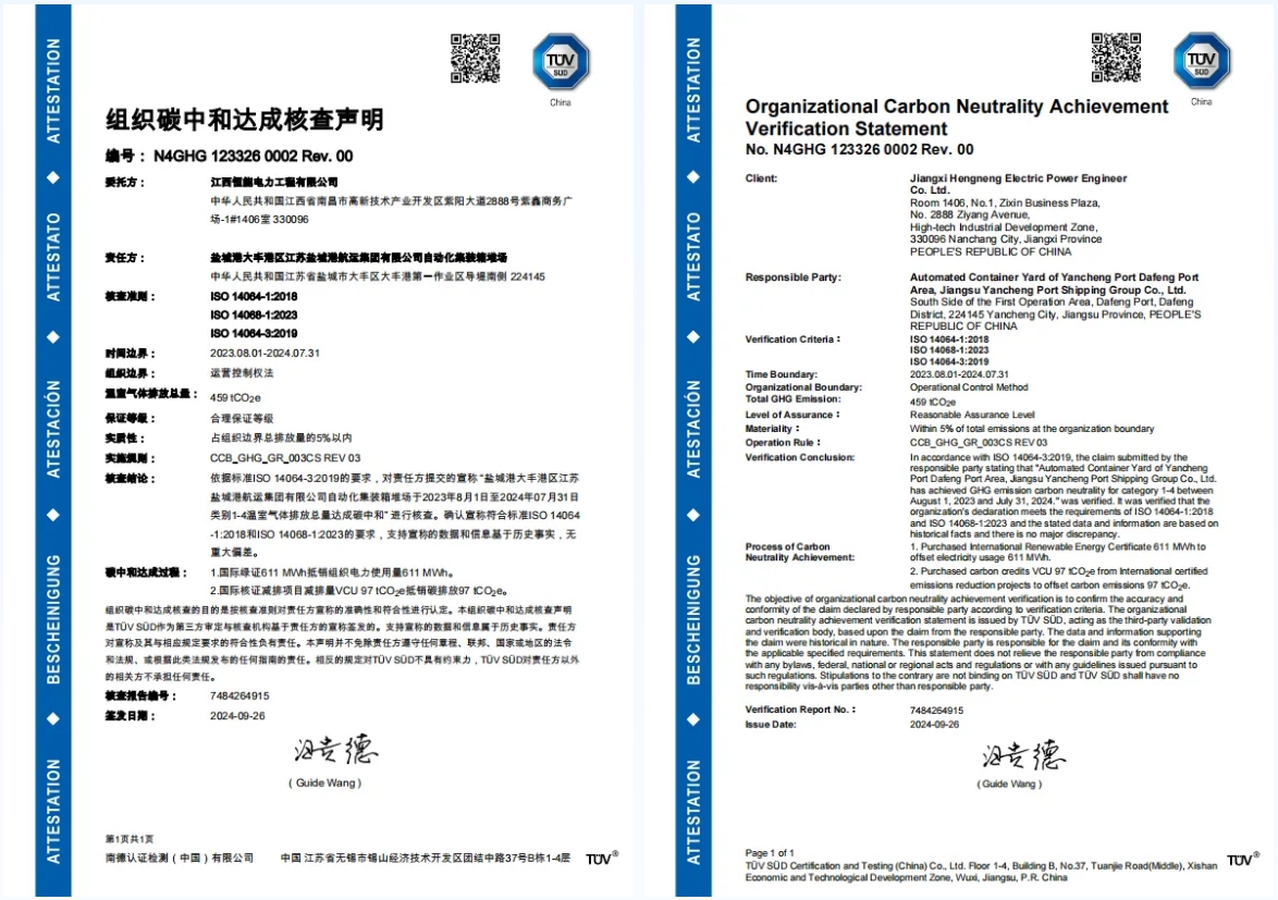 9月26日,鹽城港大豐港區(qū)江蘇鹽城港航運(yùn)集團(tuán)有限公司自動(dòng)化集裝箱堆場(chǎng)獲得TUV南德意志集團(tuán)頒發(fā)的《組織碳中和達(dá)成核查聲明》,成為國(guó)內(nèi)首個(gè)獲得“碳中和”認(rèn)證的堆場(chǎng)項(xiàng)目(TUV南德意志集團(tuán)成立于1866年,總部位于德國(guó)慕尼黑,是世界上規(guī)模最大、最古老的TUV檢驗(yàn)機(jī)構(gòu))。這是繼2023年鹽城港自動(dòng)化集裝箱堆場(chǎng)獲得碳中和承諾審定以來(lái),鹽城港在落實(shí)國(guó)家“雙碳”目標(biāo),積極推動(dòng)港口綠色低碳發(fā)展,奮力為鹽城勇當(dāng)全省發(fā)展新質(zhì)生產(chǎn)力重要陣地“碳路先鋒”做出的又一項(xiàng)重要實(shí)踐。