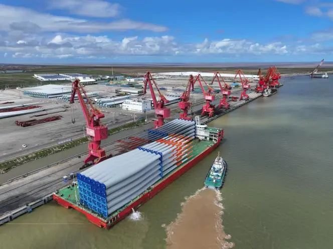 在新時代“鹽城港鐵軍淮海戰役”市場開拓大會戰期間,忽聞“遠景能源印度項目”有成套葉片出口計劃,鹽城港射陽港區風電公司攬貨組在得知此消息后,立即奔赴遠景能源物流部、船代、船東、貨代等單位,登門宣傳射陽港口岸開放情況,最終達成合作。港區也在突破“外貿風電”新貨種的同時,實現了“單船作業風電葉片數量最多”“作業效率時間最短”兩項之最。截至當前,實現外貿風電吞吐量12.15萬噸。