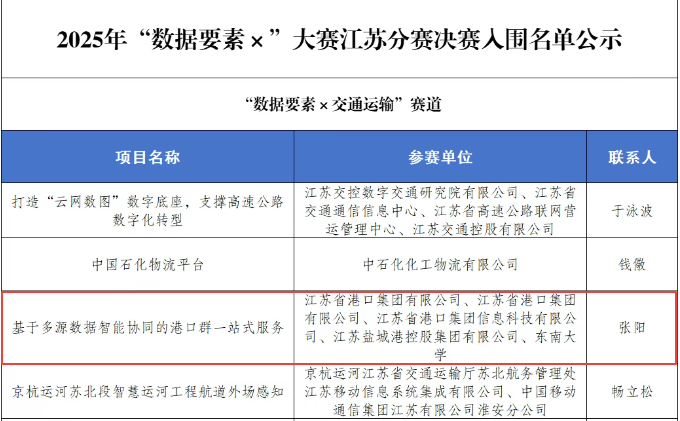 近日,2025年“數據要素×”大賽江蘇分賽決賽入圍名單公示,由省港口集團、鹽城港集團、東南大學聯合申報的《基于多源數據智能協同的港口群一站式服務》項目,成功入圍2025年“數據要素×”大賽江蘇分賽決賽。