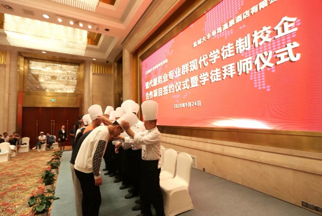 據悉,大豐中等專業學校和大豐港集團旗下半島溫泉酒店簽訂協議,雙方將共同探索建立校企“聯合招生、聯合培養、定向就業”的人才培養長效機制,為創新人才培養方式提供了一個嶄新平臺。通過合作,學校和企業進行優勢互補,實現資源共享?;顒又校瑢W校、酒店、家長、學生四方代表簽訂了現代學徒制工學交替跟崗實習協議,并舉行首批學徒制拜師儀式,23名學生順利拜師跟崗。