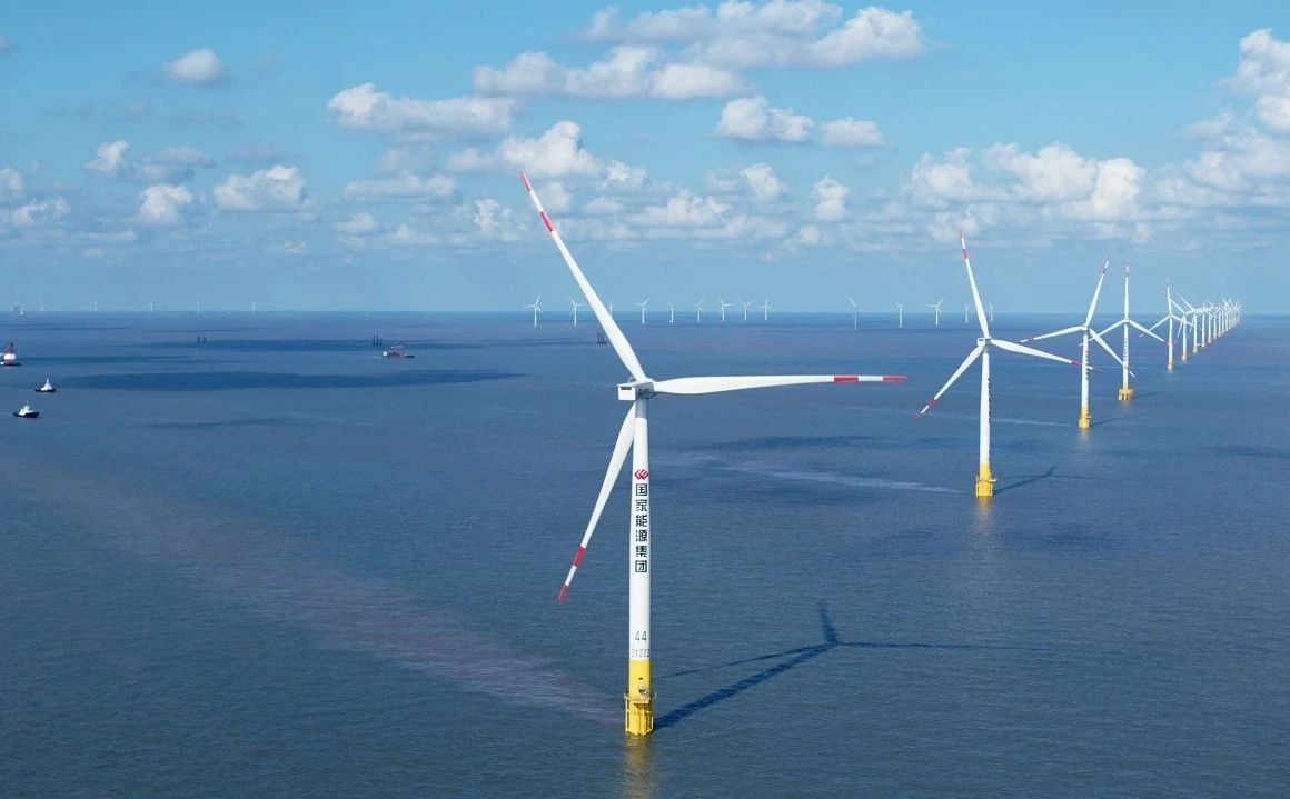 在東臺北條子泥海域和竹根沙海域,125臺風機隨風“起舞”。中國首個中外合資海上風電項目——國家能源集團和法國電力集團合資建設的國華東臺海上50萬千瓦風電項目,年均發電量約11億度,可滿足近200萬居民年用電需求。