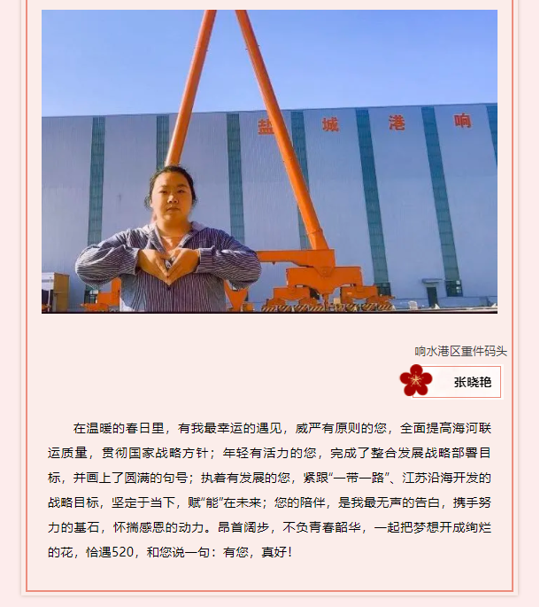 “520” 表白日 今天有人告白親情 有人告白愛情 有人告白友情 “520”不僅有暖心的告白 更有堅毅的奮斗 鹽城港人用奮斗 告白向海圖強、筑夢海洋的初心和使命 一起來聽聽鹽城港人的花式告白~ (節選)