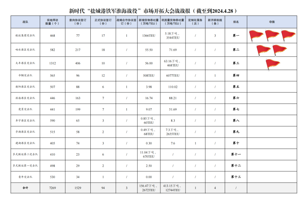 2.簽訂意向協議數量1529份:其中大豐港區突擊隊406份,響水港區突擊隊217份,黨員突擊隊199份,濱海港區突擊隊163份,巾幗突擊隊96份,射陽港區突擊隊88份,航運集團突擊隊77份,建湖港區突擊隊74份,阜寧港區突擊隊65份,亭湖港區突擊隊58份,青年突擊隊34份,多式聯運第一突擊隊29份,多式聯運第二突擊隊23份。