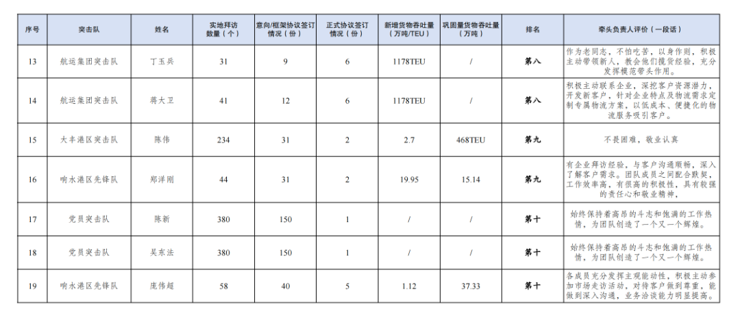 第一名:巾幗突擊隊 李婷婷(拜訪客戶312家,簽訂意向協議56份,簽訂正式協議5份,新增貨物吞吐量88TEU,鞏固量貨物吞吐量202TEU);黨員突擊隊 朱燕(拜訪客戶180家,簽訂意向協議140份,簽訂正式協議7份,新增貨物吞吐量10萬噸,鞏固量貨物吞吐量51.69萬噸)