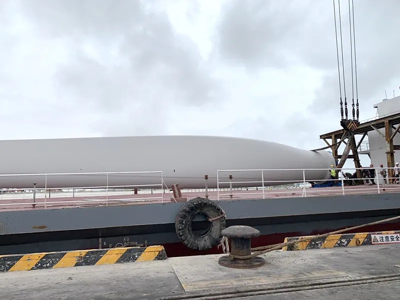 據悉,此次2套大型風電葉片采用門座式起重機的作業方式裝卸,風電葉片各長71.4米,兩套總重達280噸,該批次風電葉片將從濱海港區裝船啟運至浙江岱山機位項目處。