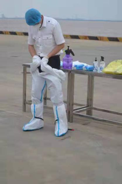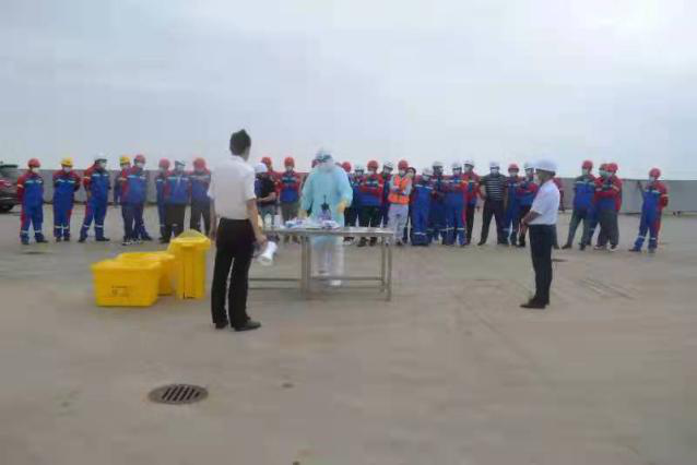 活動中,黨總支書記韋林和作培訓動員,鹽城海關駐大豐港辦事處領導對港口作業人員宣講了常態化防疫管理對港口作業的重要性,專班工作人員就規范穿脫防護服、醫療廢棄物垃圾袋消毒和鵝勁式包扎流程進行了示范操作。