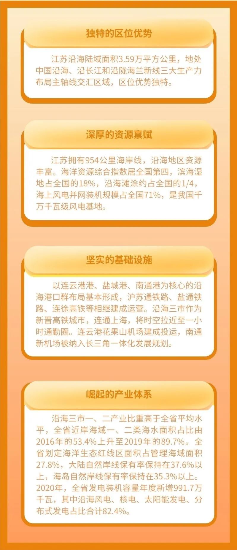 江蘇“十四五”規(guī)劃綱要明確,沿海地區(qū)深化港產(chǎn)城融合發(fā)展,著力提升海洋經(jīng)濟(jì)、生態(tài)經(jīng)濟(jì)和樞紐經(jīng)濟(jì),打造令人向往的生態(tài)風(fēng)光帶、人海和諧的藍(lán)色經(jīng)濟(jì)帶,成為新的增長極。江蘇省第十四次黨代會提出,全力推進(jìn)沿海地區(qū)高質(zhì)量發(fā)展,加快陸海統(tǒng)籌發(fā)展,大力發(fā)展海洋經(jīng)濟(jì),著力塑造“繽紛百里”“生態(tài)百里”“藍(lán)灣百里”濱海特色風(fēng)貌,努力把沿海地區(qū)打造成綠色生態(tài)高質(zhì)量發(fā)展經(jīng)濟(jì)帶。