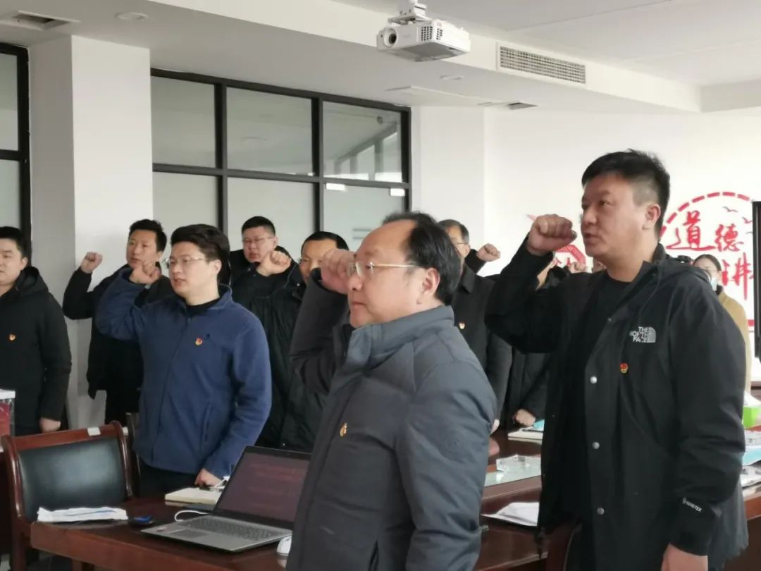 “我志愿加入中國共產黨,擁護黨的綱領,遵守黨的章程……”,響水港區黨總支書記帶領全體黨員面對黨旗,重溫入黨誓詞,進一步堅定理想信念。鏗鏘有力的宣誓聲響徹室內,現場所有人都深受感染,仿佛回到了那個風雨如磐的年代。
