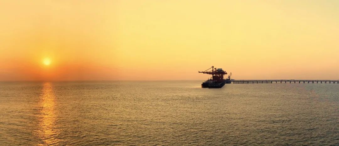 海平面上,太陽冉冉升起,映紅了海面和天空,照耀著海港的迷人和神奇,新興和璀璨。