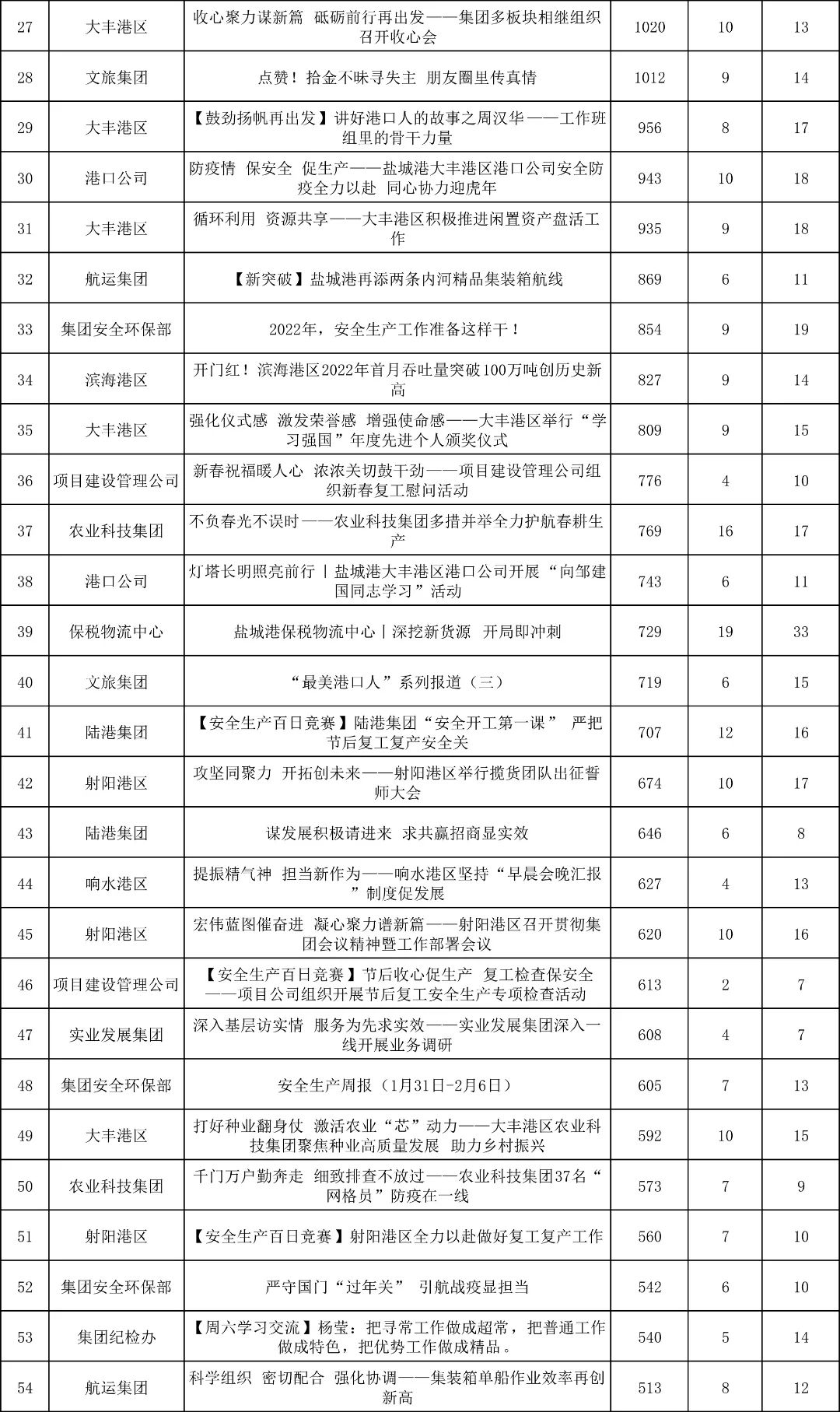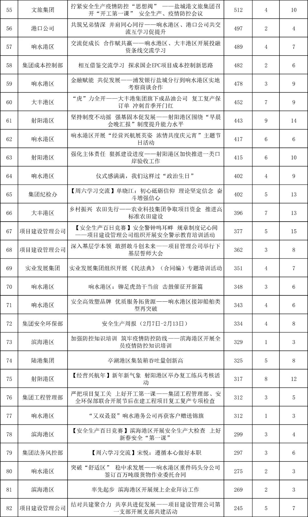 “首季開門紅”向來是新聞報道的高產期,特別是一線生產單位亮點頻出。從二月份稿件數據統計來看,大豐港區依然蟬聯第一“寶座”,發稿18篇;港口公司繼續發力,成稿11篇,位列第二;響水港區緊隨其后,發稿9篇。其他單位齊齊發力,紛紛積極供稿!