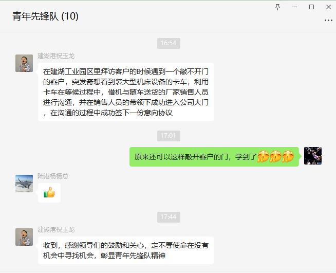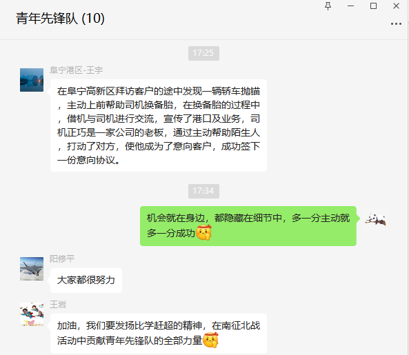 使命催人奮進,實干促人成長。青年先鋒隊特別注重隊員業務能力的持續提升。每周請一位隊員在青年先鋒隊群內分享拜訪心得,通過交流互動,不僅掌握了更高效的拜訪技巧,還加深了對港口需求趨勢的理解。