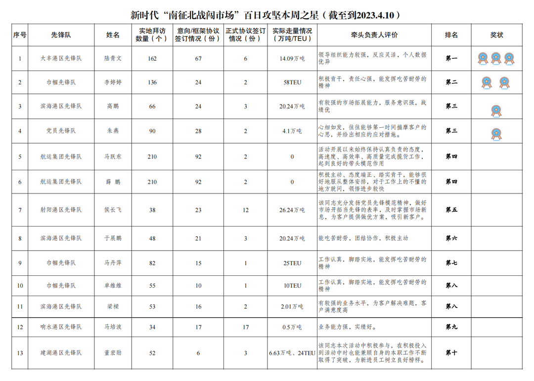 第三名:濱海港區(qū)先鋒隊(duì) 高鵬(拜訪客戶66家,簽訂意向協(xié)議24份,簽訂正式協(xié)議3份,實(shí)際走量20.24萬噸),黨員先鋒隊(duì) 朱燕(拜訪客戶90家,簽訂意向協(xié)議28份,簽訂正式協(xié)議2份,實(shí)際走量4.1萬噸)