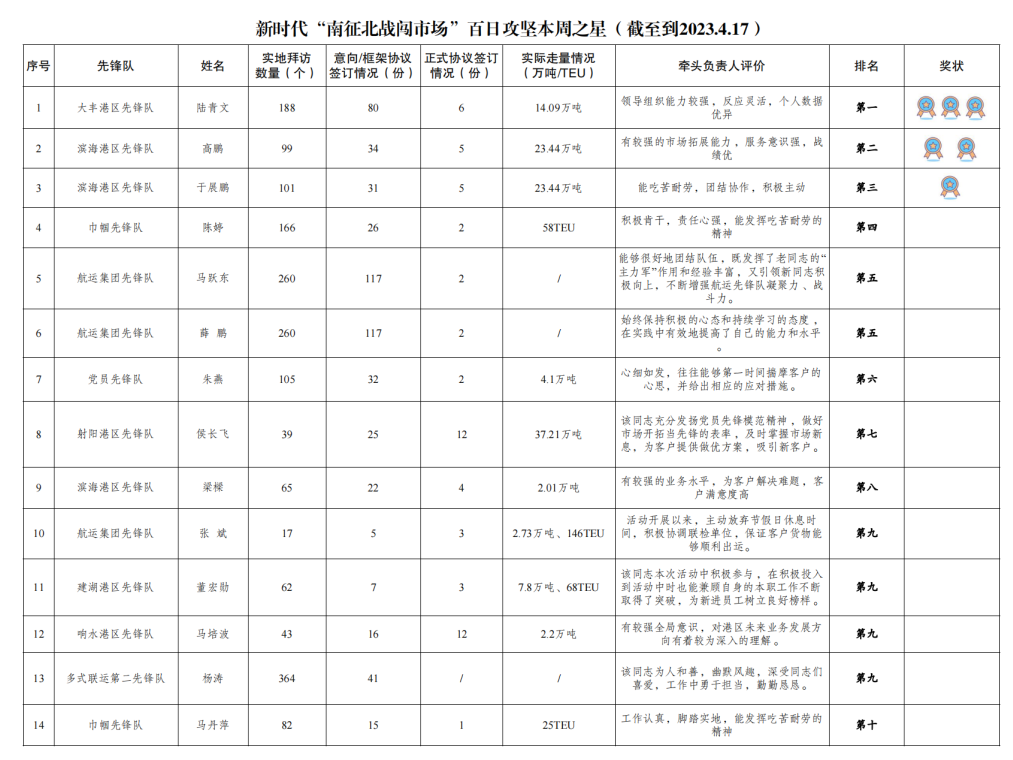 第二名:濱海港區(qū)先鋒隊 高鵬(拜訪客戶99家,簽訂意向協(xié)議34份,簽訂正式協(xié)議5份,實際走量23.44萬噸)