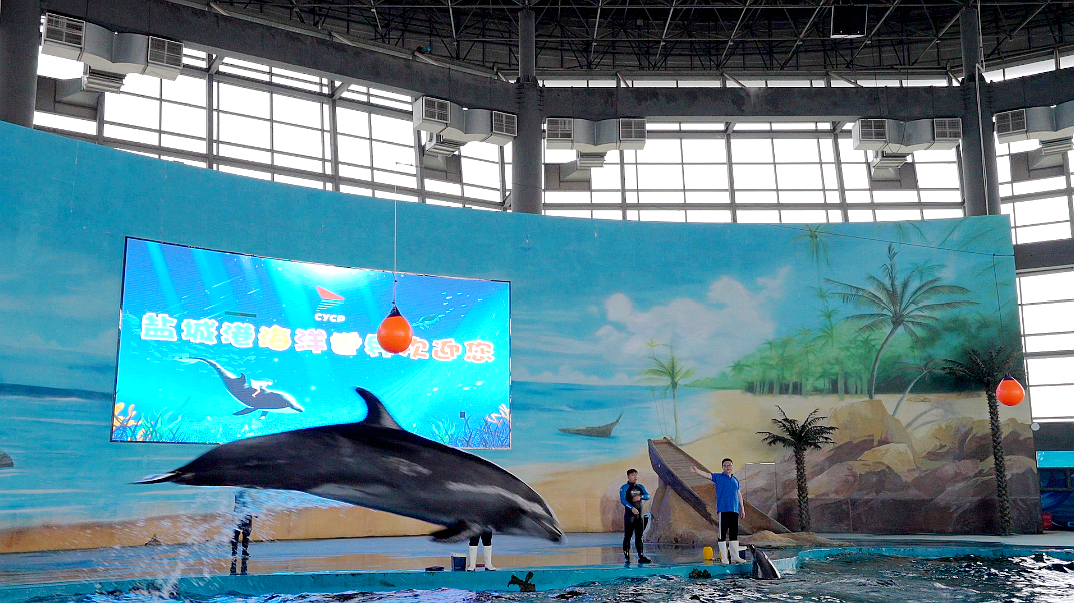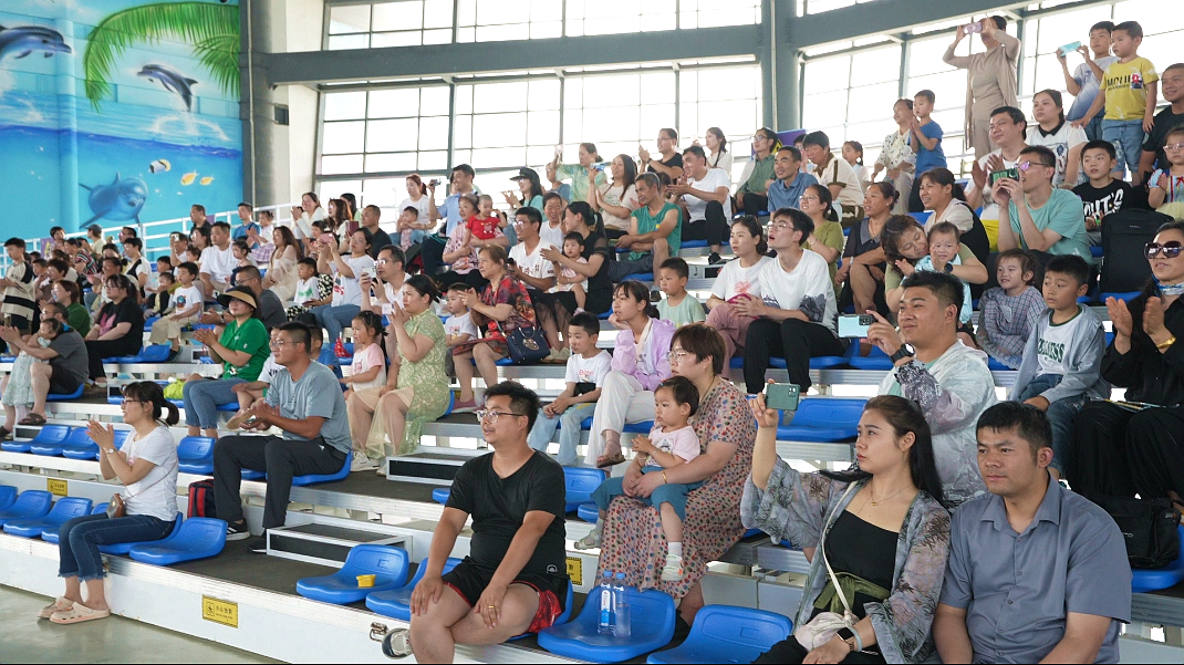 在海洋世界里,可愛的海豚在馴養(yǎng)員的指揮下盡情地舞動(dòng)著,從水中一躍而上而又輕輕落入水中,展現(xiàn)著靈活的身姿。海豚的精彩表演和與觀眾的親密互動(dòng),贏得游客陣陣喝彩和掌聲。
