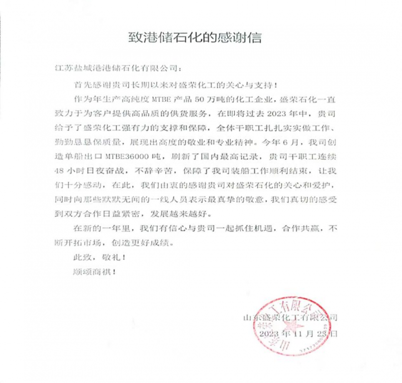今年以來港儲石化公司全體干部職工堅持以“時間就是金錢,程序體現規矩,質量鑄就精品,效率就是生命”為宗旨,不斷提升服務品質及工作效率,獲得了客戶的贊賞與肯定。近期,合作客戶山東玉皇盛榮化工寄來一封感謝信,信中內容充分肯定了港儲石化的服務品質,并由衷地表達了感謝。