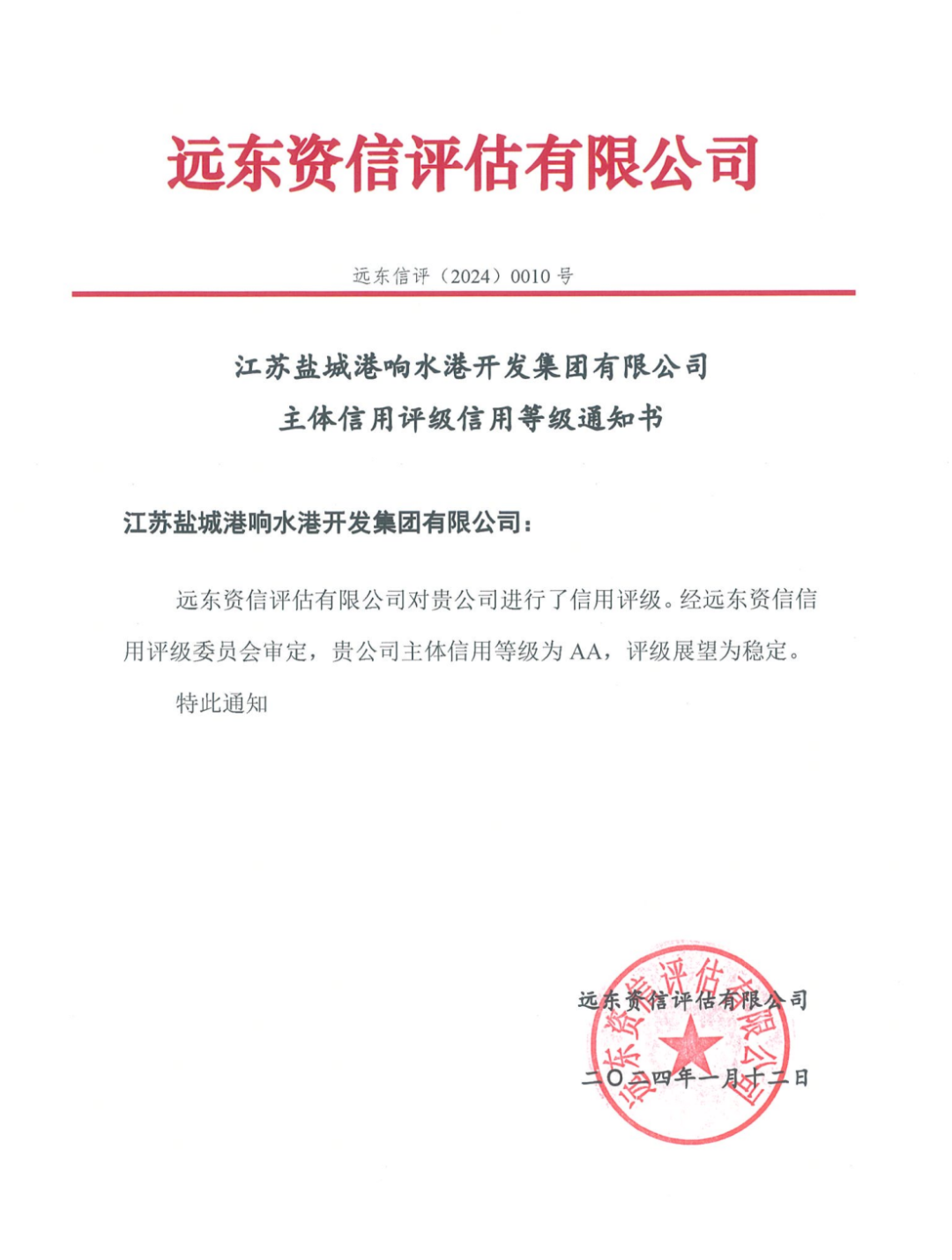 近日,遠(yuǎn)東資信信用評(píng)級(jí)委員會(huì)審定,江蘇鹽城港響水港開發(fā)集團(tuán)有限公司成功取得AA主體信用評(píng)級(jí),評(píng)級(jí)展望為穩(wěn)定。