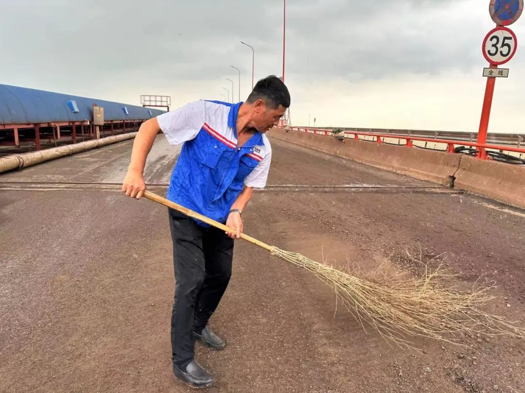 在糧食碼頭引橋,散落的貨物殘渣隨處可見,清掃隊員們迅速行動,認真細致地進行清理,確保做到不漏項、不脫節、無死角、無盲區。