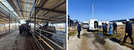 棚舍內(nèi),裝載機(jī)往來穿梭,轟鳴聲不斷。工作人員加班加點(diǎn)清理牛糞并運(yùn)往糞污處理區(qū),對(duì)牛棚進(jìn)行全面清掃。身著防護(hù)服的消毒人員,手持專業(yè)消殺設(shè)備,對(duì)場地、棚舍、通道以及各類設(shè)備進(jìn)行全方位消毒,為種牛營造一個(gè)安全、衛(wèi)生的環(huán)境。